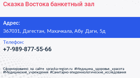 Сказка Востока, банкетный зал по адресу 367031, Дагестан, Махачкала, Абу Даги, 5д в дальнейшем Организация, размещена в следующих категориях: