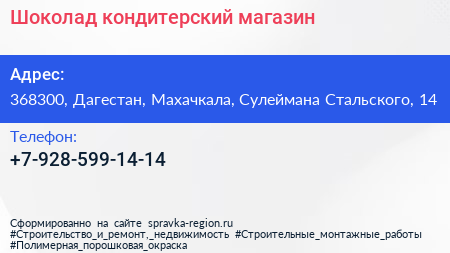 Шоколад, кондитерский магазин по адресу 368300, Дагестан, Махачкала, Сулеймана Стальского, 14 в дальнейшем Организация, размещена в следующих категориях: