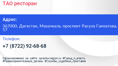 TAO, ресторан по адресу 367000, Дагестан, Махачкала, проспект Расула Гамзатова, 57 в дальнейшем Организация, размещена в следующих категориях: