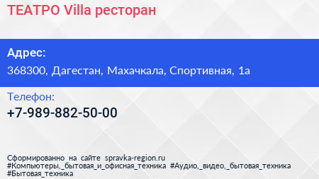 ТЕАТРО-Villa, ресторан по адресу 368300, Дагестан, Махачкала, Спортивная, 1а в дальнейшем Организация, размещена в следующих категориях: