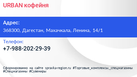 URBAN, кофейня по адресу 368300, Дагестан, Махачкала, Ленина, 14/1 в дальнейшем Организация, размещена в следующих категориях: