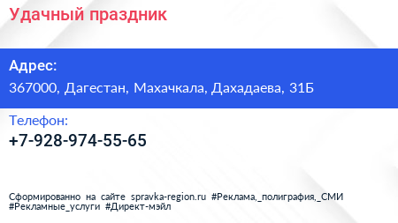 Удачный праздник по адресу 367000, Дагестан, Махачкала, Дахадаева, 31Б в дальнейшем Организация, размещена в следующих категориях: