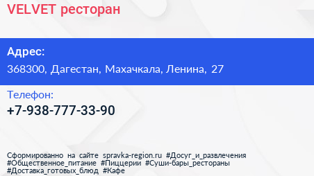 VELVET, ресторан по адресу 368300, Дагестан, Махачкала, Ленина, 27 в дальнейшем Организация, размещена в следующих категориях: