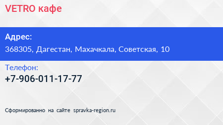 VETRO, кафе по адресу 368305, Дагестан, Махачкала, Советская, 10 в дальнейшем Организация, размещена в следующих категориях: