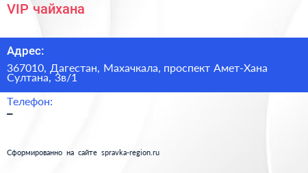 VIP, чайхана по адресу 367010, Дагестан, Махачкала, проспект Амет-Хана Султана, 3в/1 в дальнейшем Организация, размещена в следующих категориях: