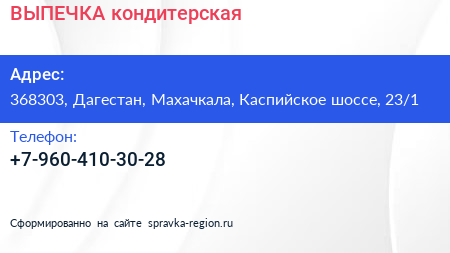 ВЫПЕЧКА, кондитерская по адресу 368303, Дагестан, Махачкала, Каспийское шоссе, 23/1 в дальнейшем Организация, размещена в следующих категориях: