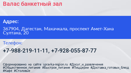Валас, банкетный зал по адресу 367904, Дагестан, Махачкала, проспект Амет-Хана Султана, 20 в дальнейшем Организация, размещена в следующих категориях: