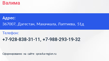 Валима по адресу 367007, Дагестан, Махачкала, Лаптиева, 51д в дальнейшем Организация, размещена в следующих категориях: