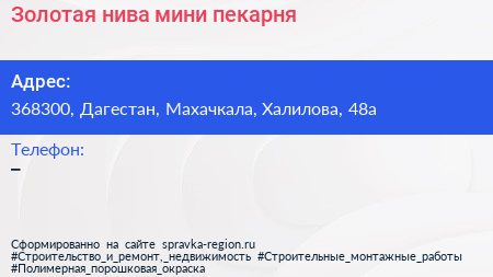 Золотая нива, мини-пекарня по адресу 368300, Дагестан, Махачкала, Халилова, 48а в дальнейшем Организация, размещена в следующих категориях: