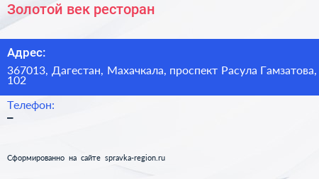 Золотой век, ресторан по адресу 367013, Дагестан, Махачкала, проспект Расула Гамзатова, 102 в дальнейшем Организация, размещена в следующих категориях: