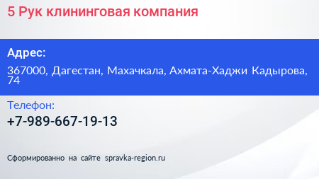 5 Рук, клининговая компания по адресу 367000, Дагестан, Махачкала, Ахмата-Хаджи Кадырова, 74 в дальнейшем Организация, размещена в следующих категориях: