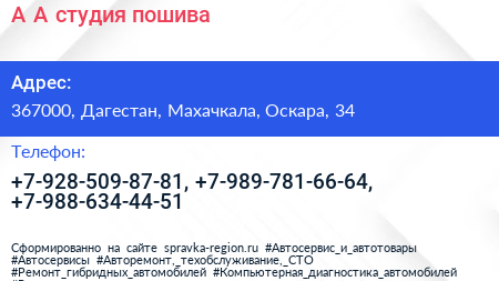 А & А, студия пошива по адресу 367000, Дагестан, Махачкала, Оскара, 34 в дальнейшем Организация, размещена в следующих категориях:
