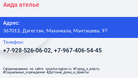 Аида, ателье по адресу 367013, Дагестан, Махачкала, Манташева, 97 в дальнейшем Организация, размещена в следующих категориях: