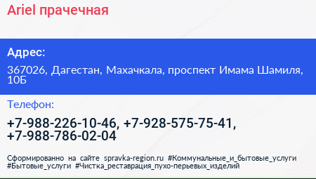Ariel, прачечная по адресу 367026, Дагестан, Махачкала, проспект Имама Шамиля, 10Б в дальнейшем Организация, размещена в следующих категориях: