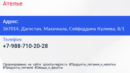 Ателье по адресу 367014, Дагестан, Махачкала, Сейфеддина Кулиева, 8/1 в дальнейшем Организация, размещена в следующих категориях: