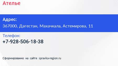 Ателье по адресу 367000, Дагестан, Махачкала, Астемирова, 11 в дальнейшем Организация, размещена в следующих категориях: