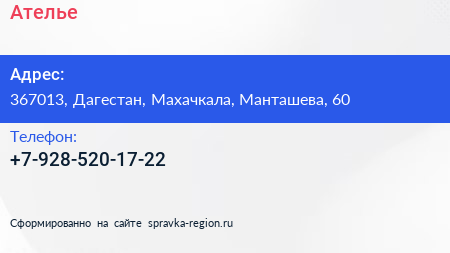 Ателье по адресу 367013, Дагестан, Махачкала, Манташева, 60 в дальнейшем Организация, размещена в следующих категориях: