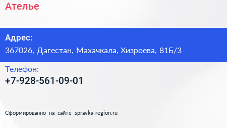 Ателье по адресу 367026, Дагестан, Махачкала, Хизроева, 81Б/3 в дальнейшем Организация, размещена в следующих категориях: