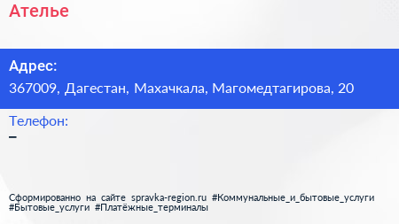 Ателье по адресу 367009, Дагестан, Махачкала, Магомедтагирова, 20 в дальнейшем Организация, размещена в следующих категориях: