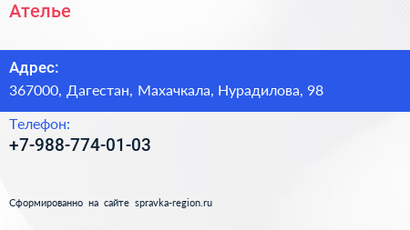 Ателье по адресу 367000, Дагестан, Махачкала, Нурадилова, 98 в дальнейшем Организация, размещена в следующих категориях: