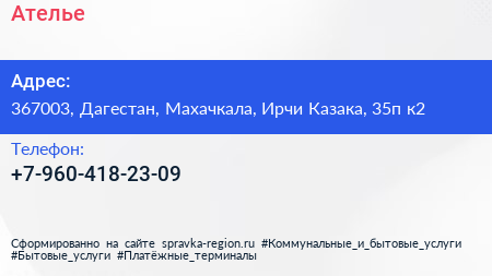 Ателье по адресу 367003, Дагестан, Махачкала, Ирчи Казака, 35п к2 в дальнейшем Организация, размещена в следующих категориях: