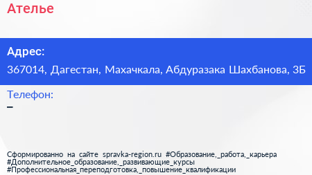 Ателье по адресу 367014, Дагестан, Махачкала, Абдуразака Шахбанова, 3Б в дальнейшем Организация, размещена в следующих категориях: