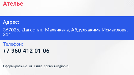 Ателье по адресу 367026, Дагестан, Махачкала, Абдулхакима Исмаилова, 21г в дальнейшем Организация, размещена в следующих категориях: