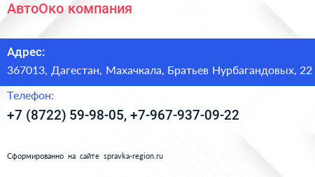 АвтоОко, компания по адресу 367013, Дагестан, Махачкала, Братьев Нурбагандовых, 22 в дальнейшем Организация, размещена в следующих категориях: