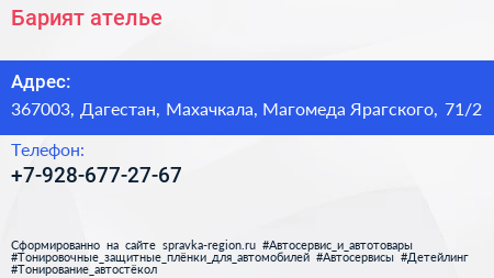 Барият, ателье по адресу 367003, Дагестан, Махачкала, Магомеда Ярагского, 71/2 в дальнейшем Организация, размещена в следующих категориях: