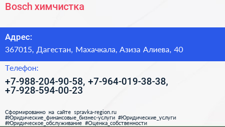 Bosch, химчистка по адресу 367015, Дагестан, Махачкала, Азиза Алиева, 40 в дальнейшем Организация, размещена в следующих категориях: