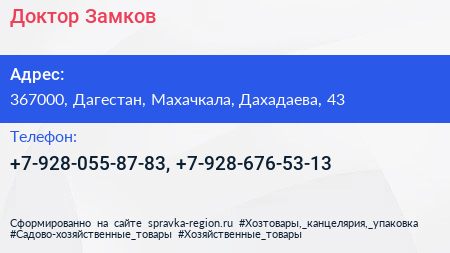 Доктор Замков по адресу 367000, Дагестан, Махачкала, Дахадаева, 43 в дальнейшем Организация, размещена в следующих категориях: