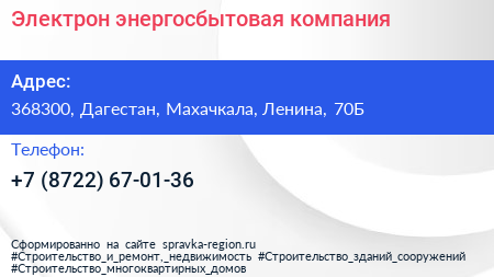 Электрон, энергосбытовая компания по адресу 368300, Дагестан, Махачкала, Ленина, 70Б в дальнейшем Организация, размещена в следующих категориях: