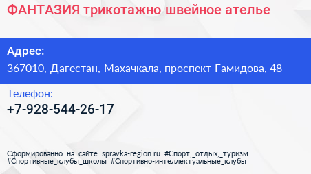 ФАНТАЗИЯ, трикотажно-швейное ателье по адресу 367010, Дагестан, Махачкала, проспект Гамидова, 48 в дальнейшем Организация, размещена в следующих категориях: