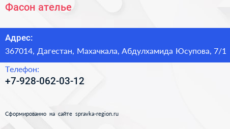 Фасон, ателье по адресу 367014, Дагестан, Махачкала, Абдулхамида Юсупова, 7/1 в дальнейшем Организация, размещена в следующих категориях: