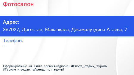 Фотосалон по адресу 367027, Дагестан, Махачкала, Джамалутдина Атаева, 7 в дальнейшем Организация, размещена в следующих категориях: