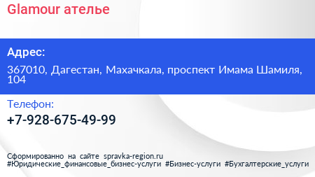 Glamour, ателье по адресу 367010, Дагестан, Махачкала, проспект Имама Шамиля, 104 в дальнейшем Организация, размещена в следующих категориях: