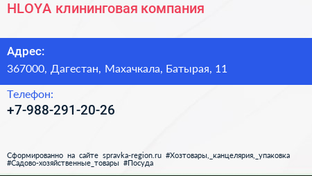 HLOYA, клининговая компания по адресу 367000, Дагестан, Махачкала, Батырая, 11 в дальнейшем Организация, размещена в следующих категориях: