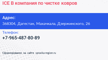 ICE.B, компания по чистке ковров по адресу 368304, Дагестан, Махачкала, Дзержинского, 26 в дальнейшем Организация, размещена в следующих категориях: