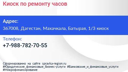 Киоск по ремонту часов по адресу 367008, Дагестан, Махачкала, Батырая, 1/3 киоск в дальнейшем Организация, размещена в следующих категориях:
