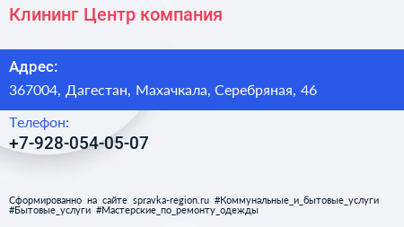Клининг Центр, компания по адресу 367004, Дагестан, Махачкала, Серебряная, 46 в дальнейшем Организация, размещена в следующих категориях: