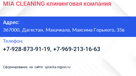 MIA CLEANING, клининговая компания по адресу 367000, Дагестан, Махачкала, Максима Горького, 35в в дальнейшем Организация, размещена в следующих категориях: