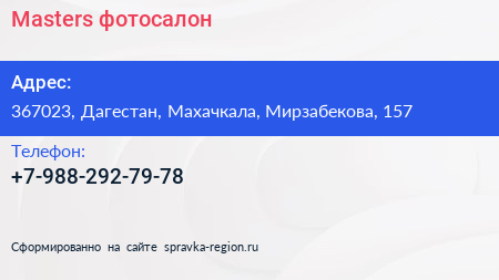 Masters, фотосалон по адресу 367023, Дагестан, Махачкала, Мирзабекова, 157 в дальнейшем Организация, размещена в следующих категориях: