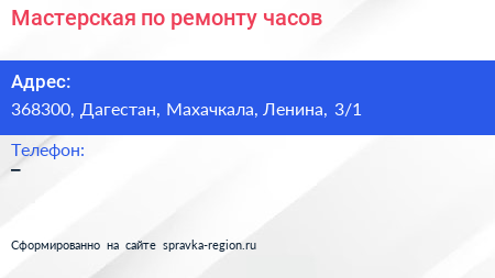 Мастерская по ремонту часов по адресу 368300, Дагестан, Махачкала, Ленина, 3/1 в дальнейшем Организация, размещена в следующих категориях: