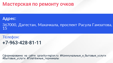 Мастерская по ремонту очков по адресу 367000, Дагестан, Махачкала, проспект Расула Гамзатова, 15 в дальнейшем Организация, размещена в следующих категориях: