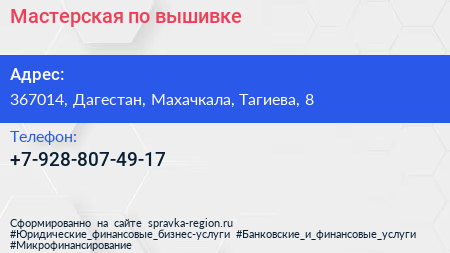 Мастерская по вышивке по адресу 367014, Дагестан, Махачкала, Тагиева, 8 в дальнейшем Организация, размещена в следующих категориях: