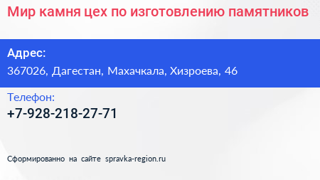 Мир камня, цех по изготовлению памятников по адресу 367026, Дагестан, Махачкала, Хизроева, 46 в дальнейшем Организация, размещена в следующих категориях:
