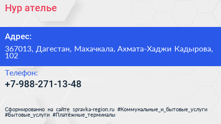 Нур, ателье по адресу 367013, Дагестан, Махачкала, Ахмата-Хаджи Кадырова, 102 в дальнейшем Организация, размещена в следующих категориях: