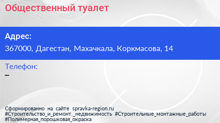 Общественный туалет по адресу 367000, Дагестан, Махачкала, Коркмасова, 14 в дальнейшем Организация, размещена в следующих категориях: