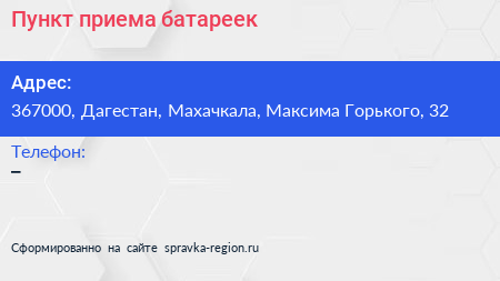 Пункт приема батареек по адресу 367000, Дагестан, Махачкала, Максима Горького, 32 в дальнейшем Организация, размещена в следующих категориях: