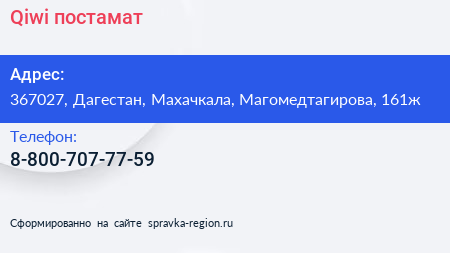 Qiwi, постамат по адресу 367027, Дагестан, Махачкала, Магомедтагирова, 161ж в дальнейшем Организация, размещена в следующих категориях: